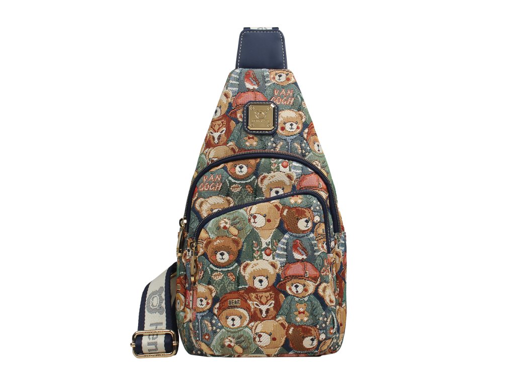 🎨 Design: Barevný potisk plný veselých medvídků s osobností, doplněný o jemné detaily v modré eko kůži a ikonický nápis “Van Gogh” pro kreativní duše.