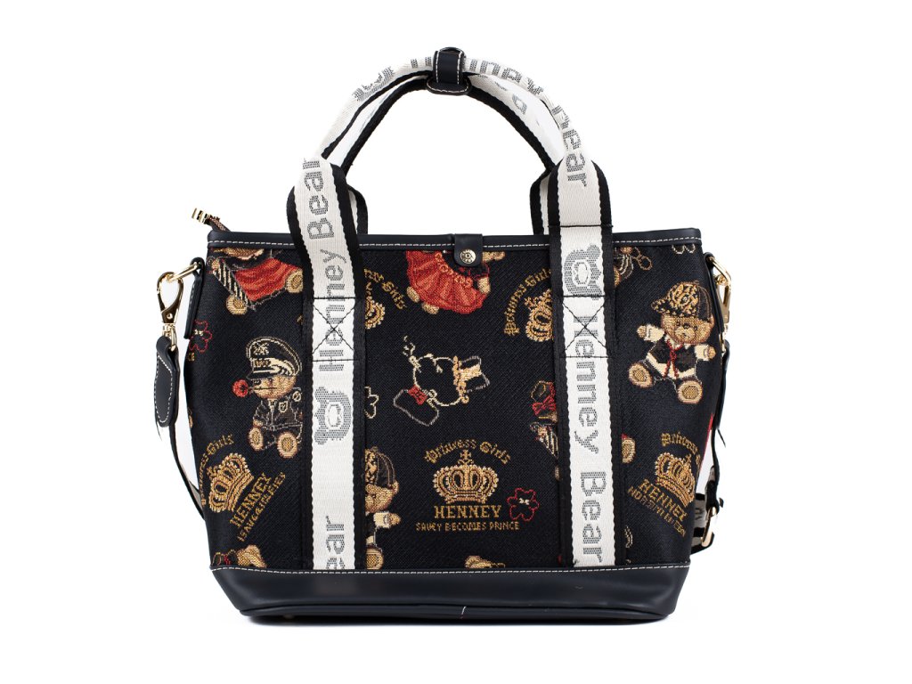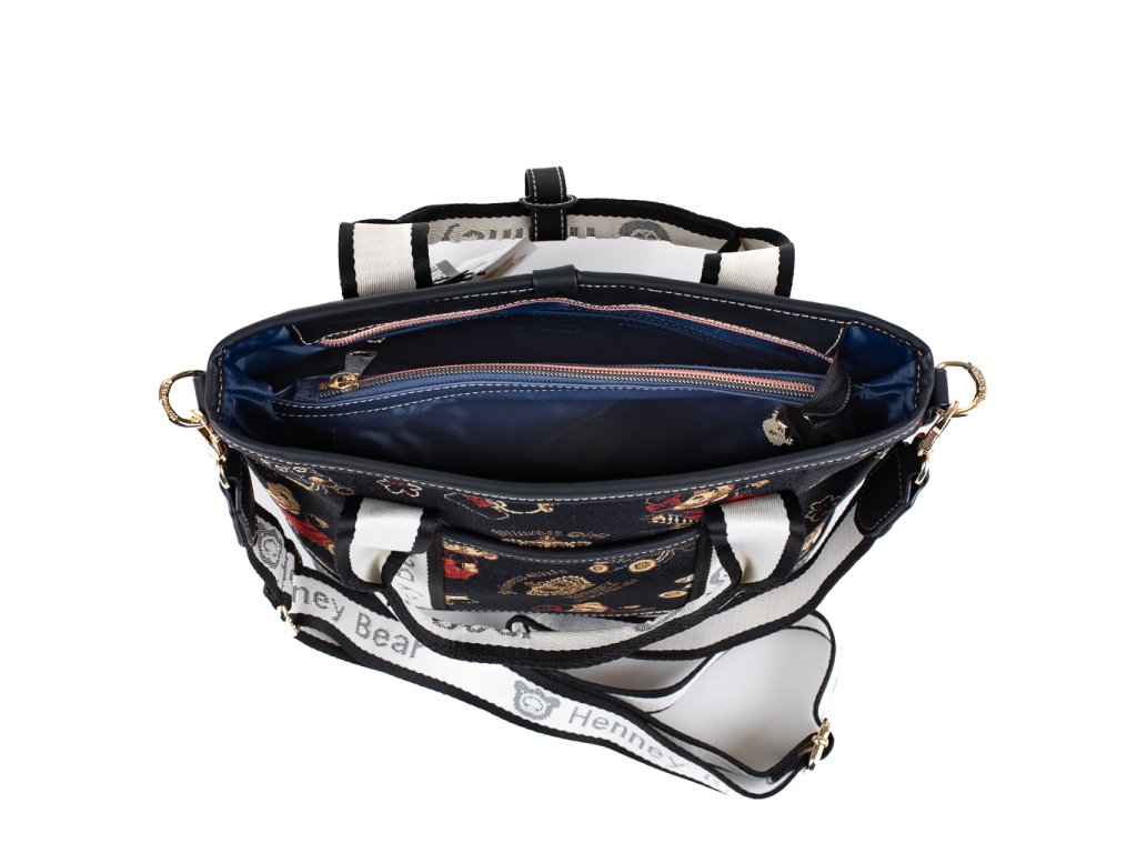 👑 Královský gobelín: Bohatě tkaný motiv s ikonickými Henney Bear postavičkami a detaily ve zlatých tónech, doplněný o černé koženkové prvky a logopopruhy značky.