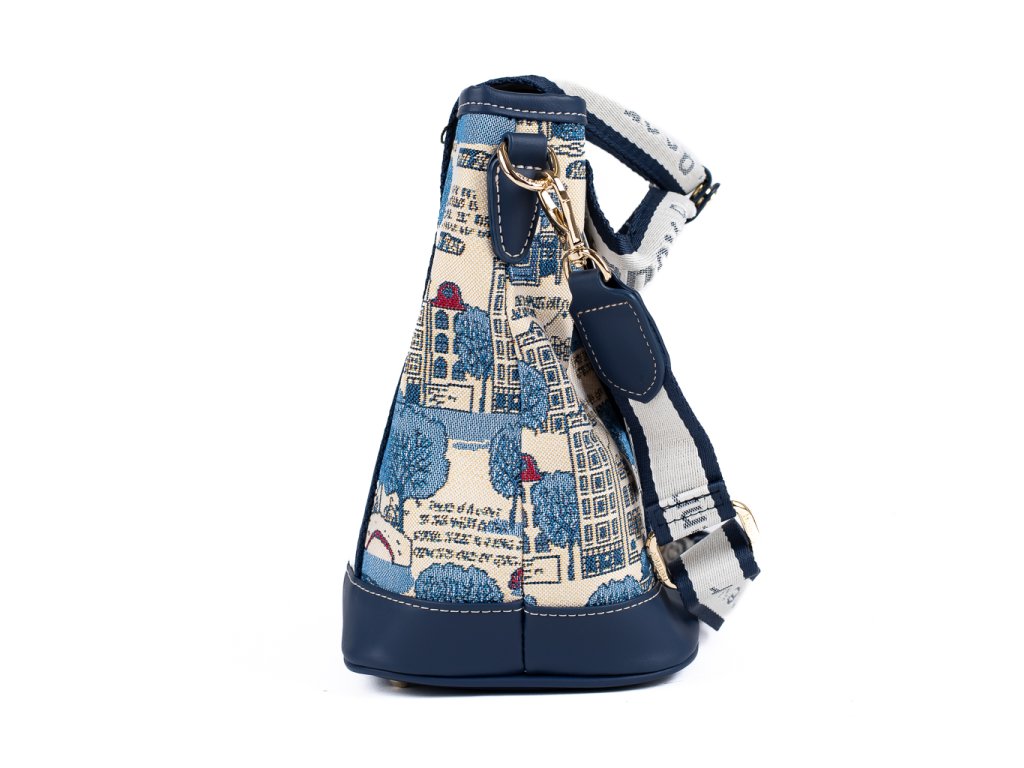 Kabelka s motivem Euro City je jako mapa milovaných evropských metropolí, zachycená na jemném tkaném plátně. Domky, stromy a detaily evokují cestování, vzpomínky a atmosféru kavárenských uliček.