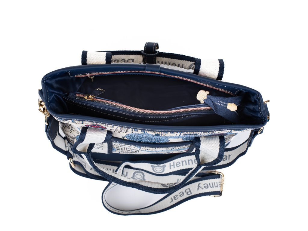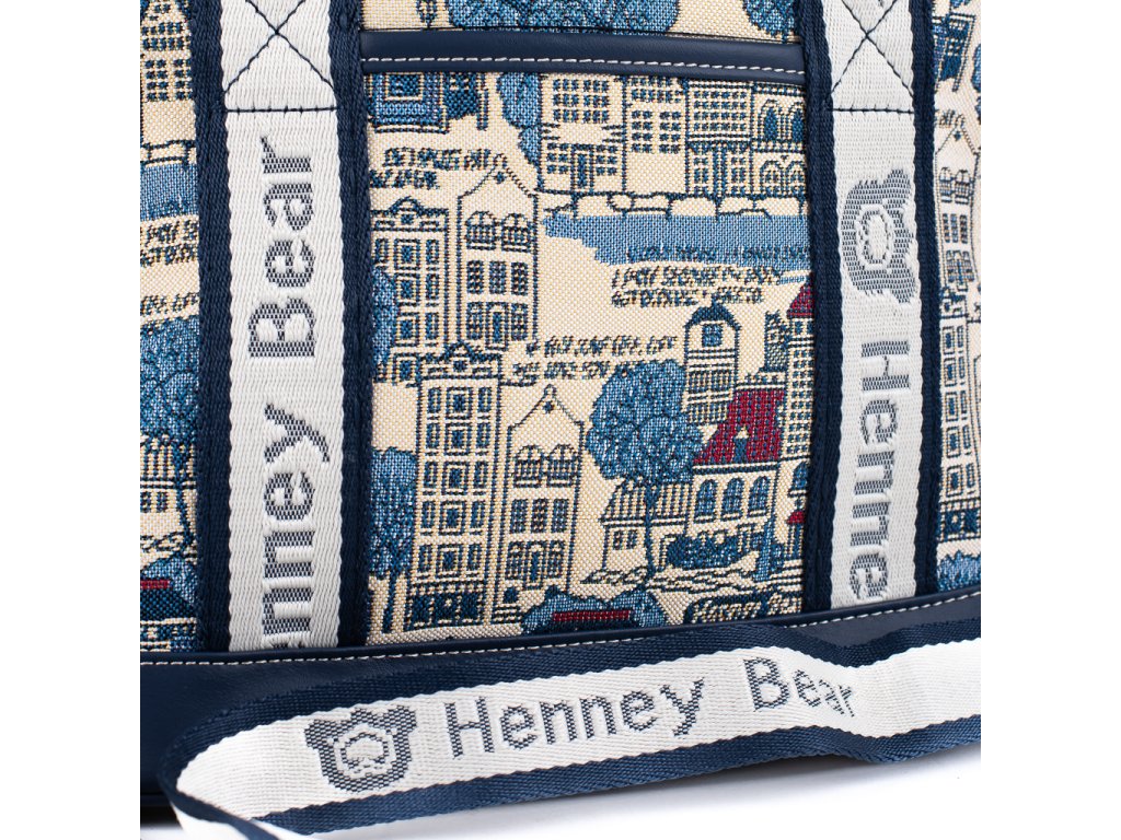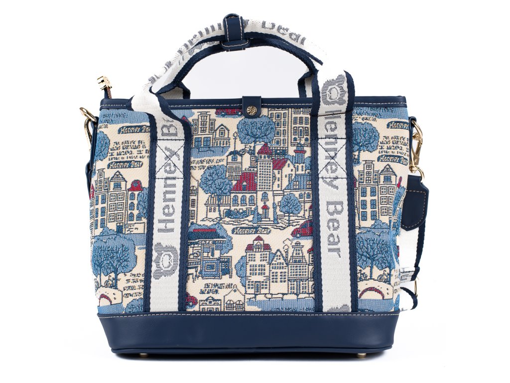 🏙️ Design s evropskou duší: Gobelínový vzor v odstínech modré, červené a béžové je doplněn o kontrastní modré koženkové detaily a výrazné textilní popruhy Henney Bear.