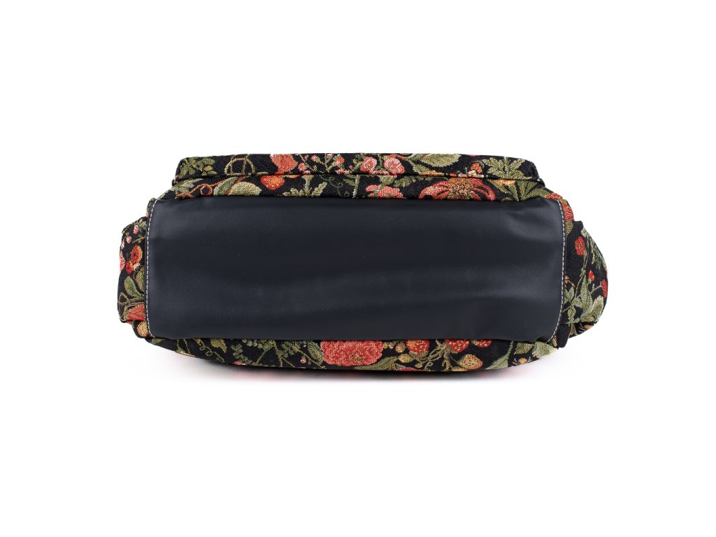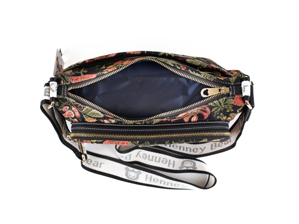🎨 Design: Bohatě tkaný gobelín s květinami v teplých tónech na tmavém podkladu přináší nádech romantiky. Černé koženkové detaily a decentní logo Henney Bear kabelce dodávají elegantní kontrast.