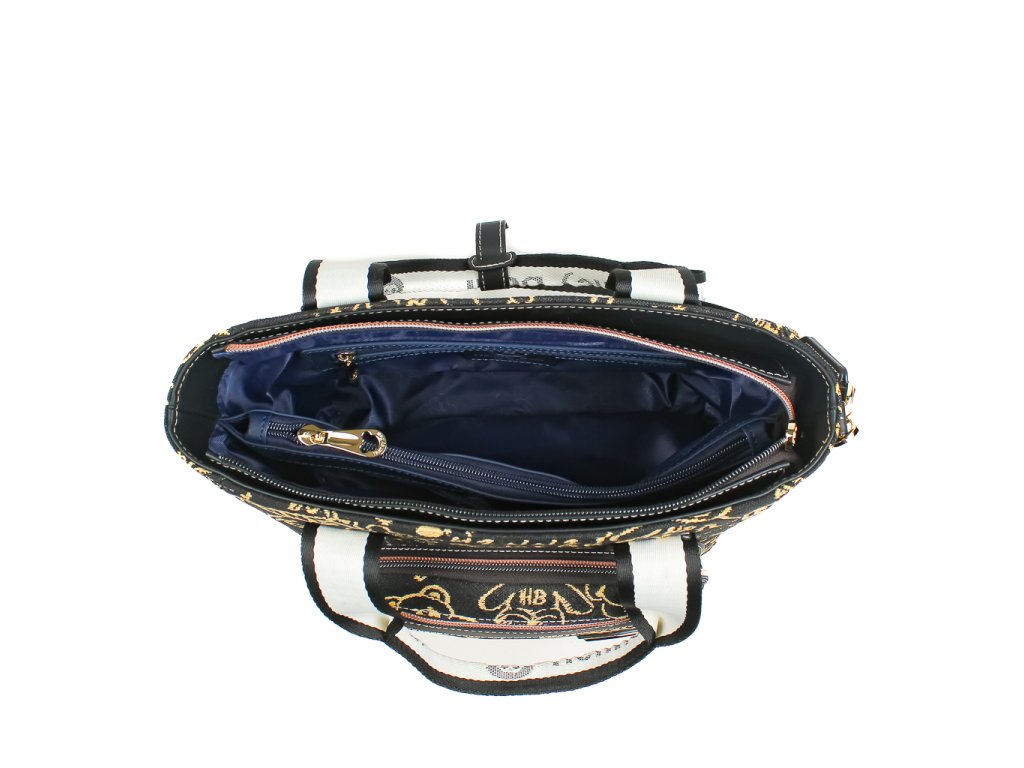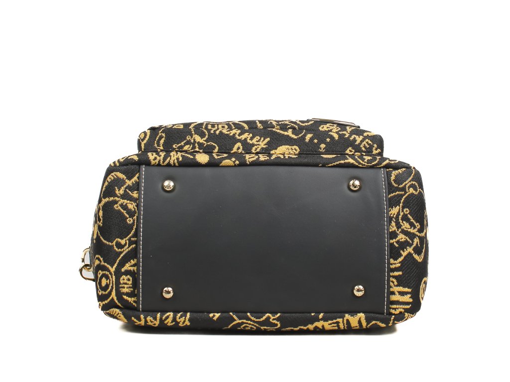 Na první pohled tě okouzlí zlatý potisk plný medvídků, log a zábavných nápisů na sytě černém pozadí 🖤💛. Elegantní rozměry (šířka 32 cm, hloubka 15 cm, výška 22 cm) zaručují, že se kabelka hodí jak na každodenní nošení, tak i na stylové výlety městem.