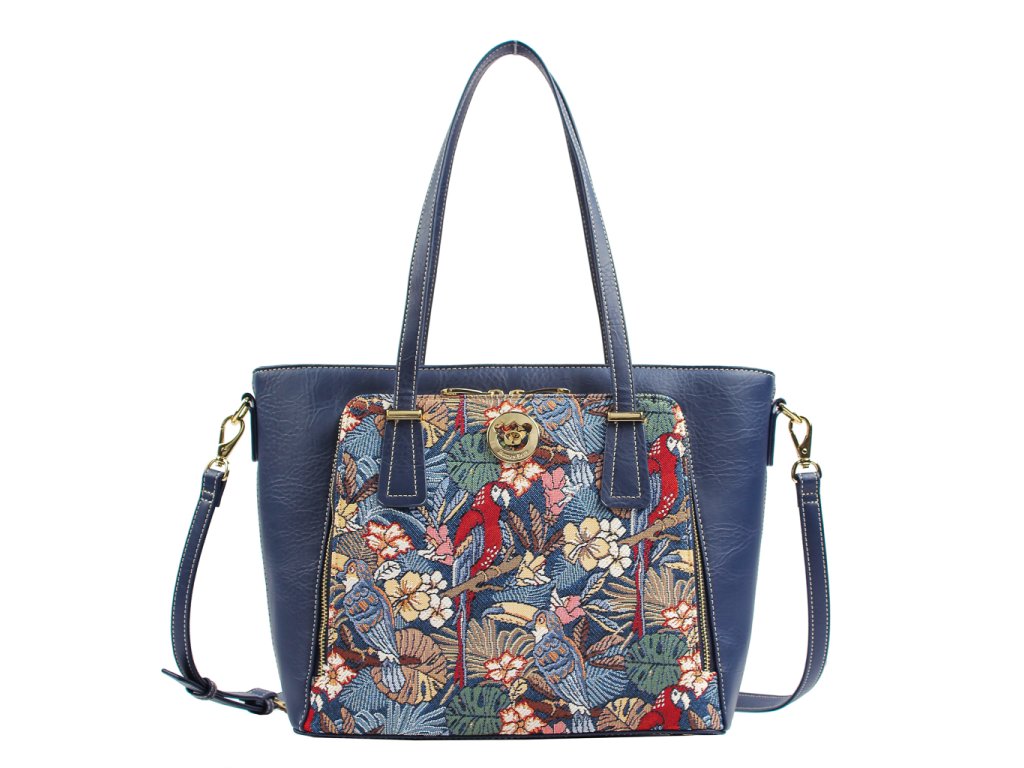 Vzor Parrot Song je vizuálně bohatý, barevný a plný života – exotické květiny, listy a papoušci vytvářejí neodolatelnou koláž s nádechem tropů. Tento gobelín působí radostně, ale zároveň zůstává elegantní díky modrým a zemitým tónům. Shopper střih doplňuje praktické detaily, které oceníš při každodenním nošení.