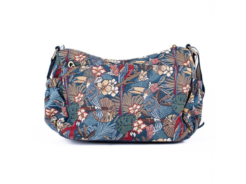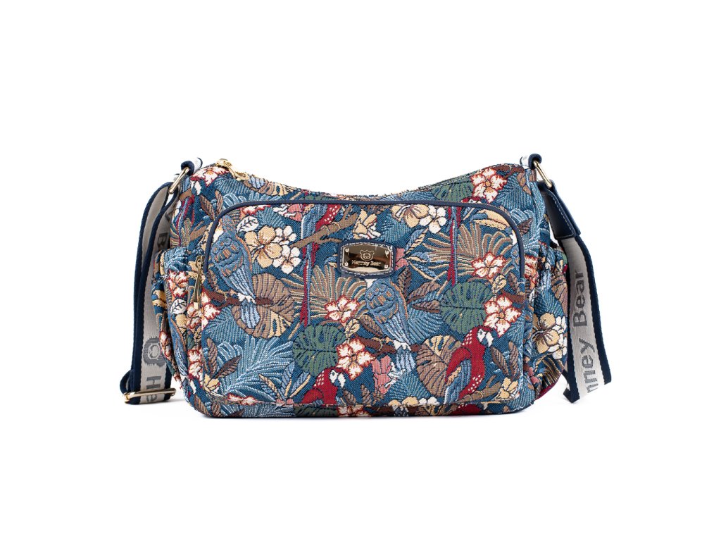 Tropická crossbody kabelka Henney Bear s motivem papoušků a květin – pro milovnice barev, přírody a originálního stylu.
