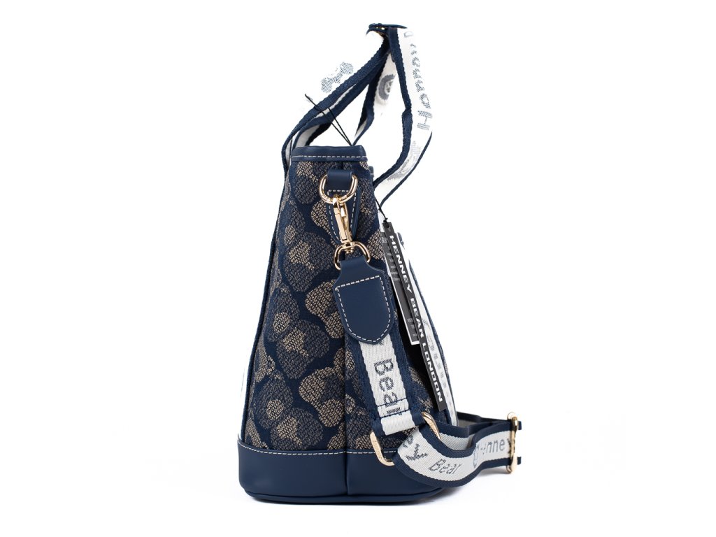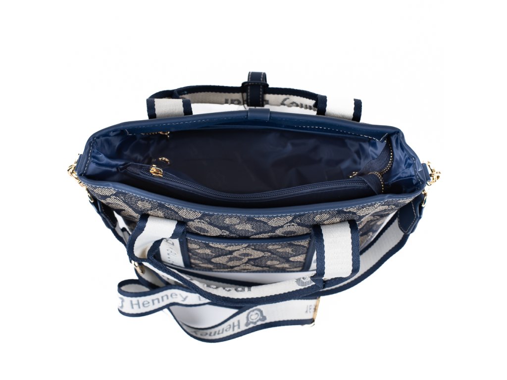 🎨 Design s duší značky: Gobelínový potisk s medvědími siluetami, kontrastní modrá koženka a textilní popruhy s logem Henney Bear. Stylová volba pro každý den.