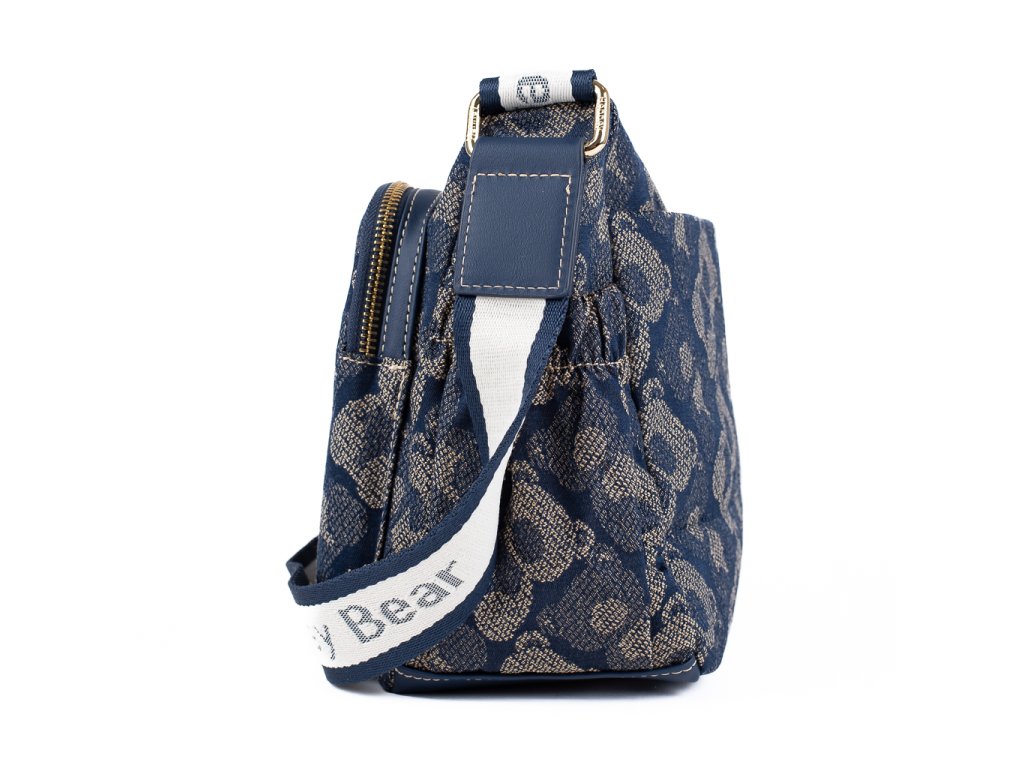 🎨 Design: Gobelínový vzor medvídků v elegantní tmavomodré barevnosti podtrhují detaily z jemné koženky a decentní zlaté logo na kovové destičce.