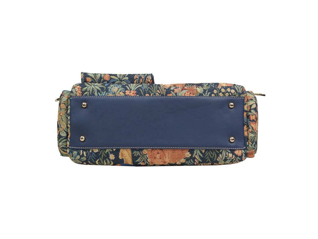 🎨 Design: Živý tapiseriový vzor plný květin a lesních zvířat je pastvou pro oči. Modré detaily z veganské koženky doplňují celkový přírodní look.