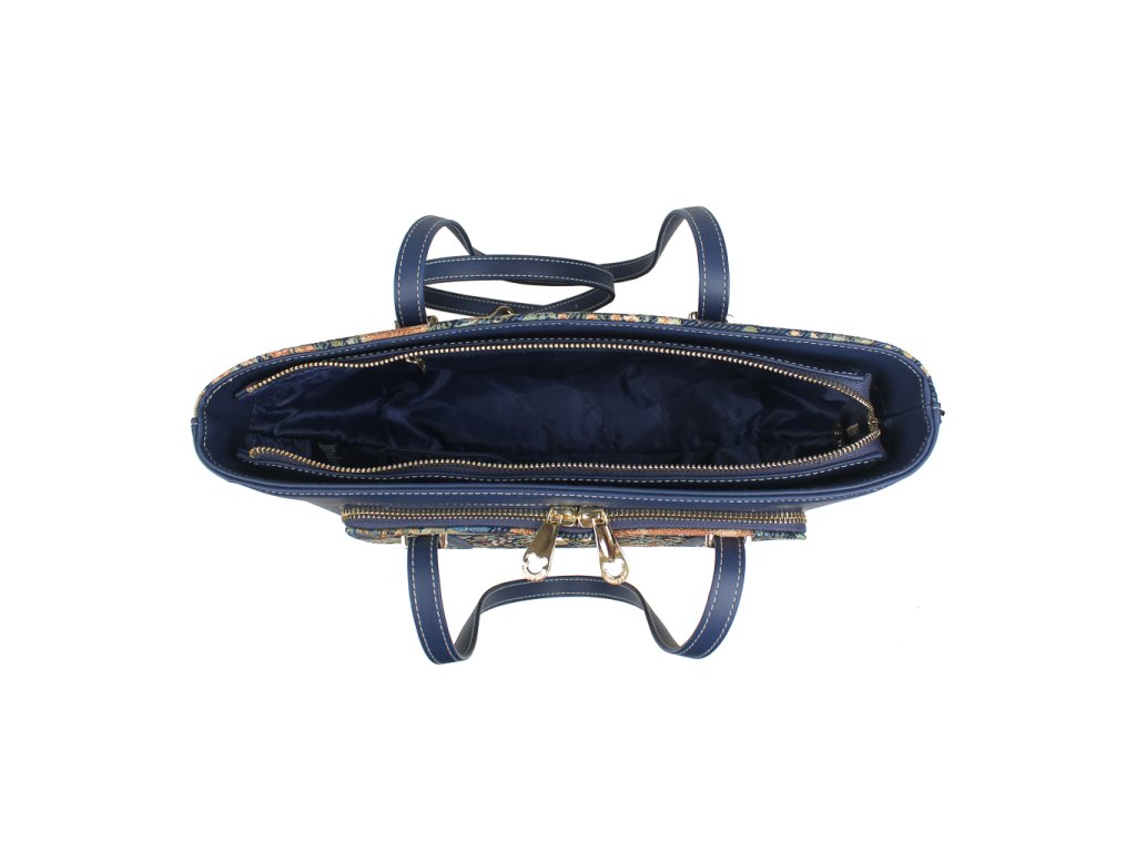🎨 Design s náladou: Jemně tkaný vzor plný barev, zvířat a květin působí poeticky a jedinečně. Spolu s modrou koženkou a zlatým logem tvoří kabelka harmonický celek s vintage duší.