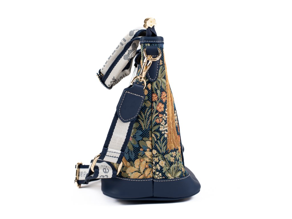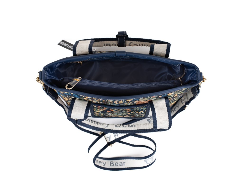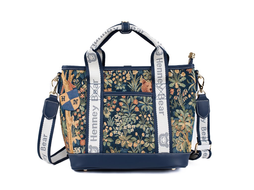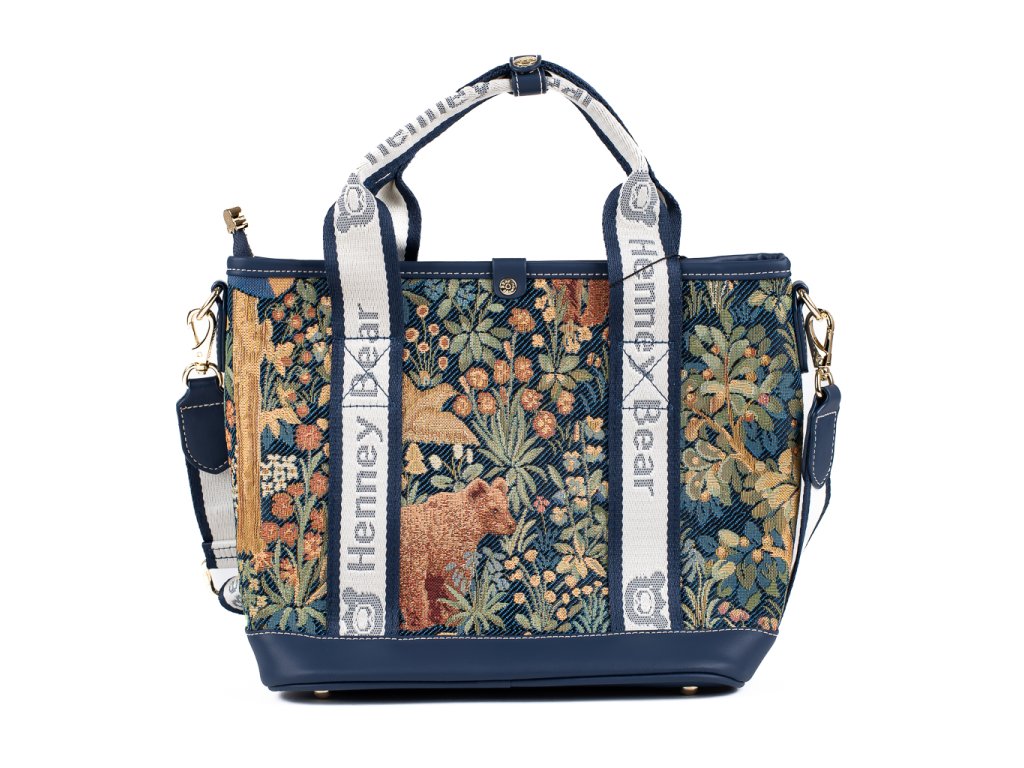 🎨 Výrazný gobelínový vzor: Bohatý přírodní motiv s medvědem uprostřed květin a vegetace, doplněný o modré koženkové detaily a logo popruhy Henney Bear.