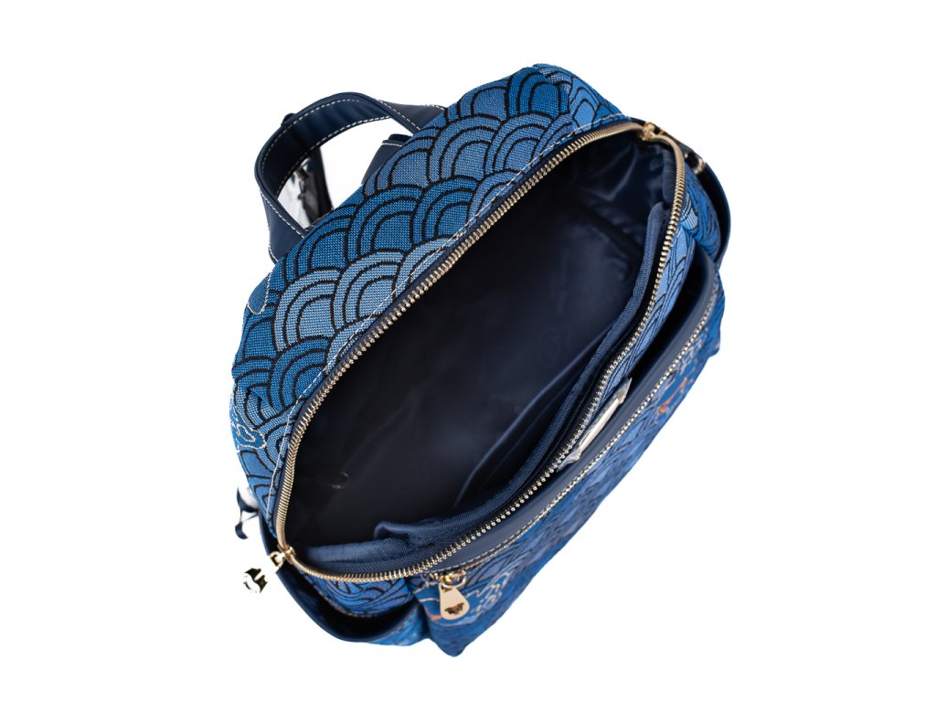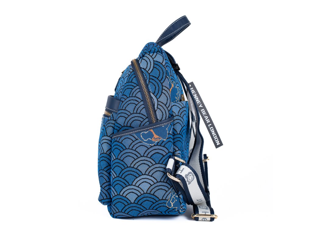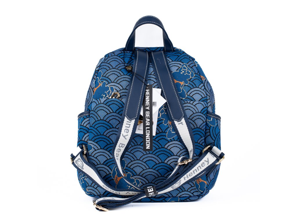 🌊 Design: Gobelínový vzor modrých vln s medvídky připomíná tradiční japonské umění se současným twistem. Doplňky z modré koženky a decentní kovový štítek dotvářejí elegantní vzhled.