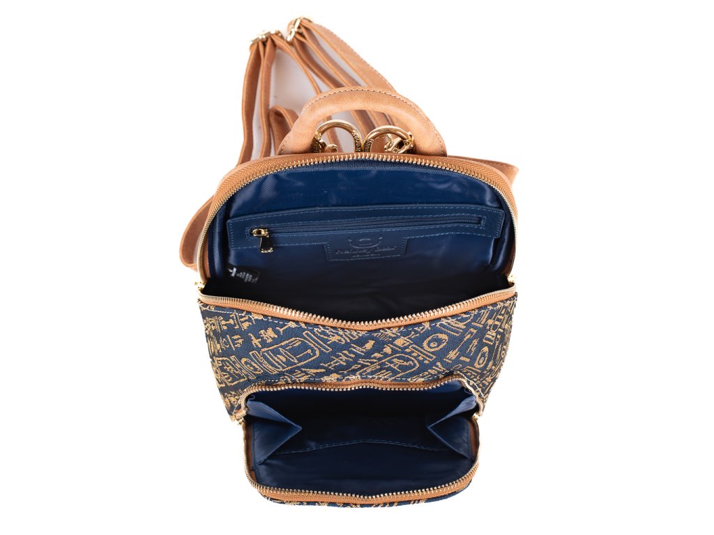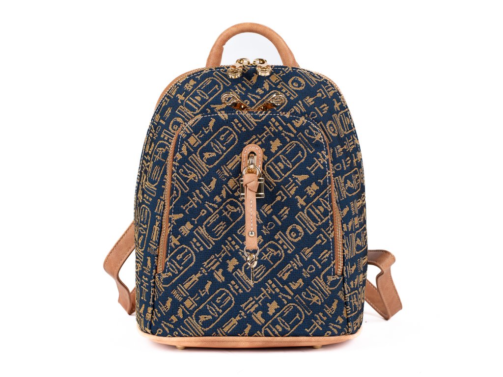 ✨ Design: Gobelín s motivem zlatého klínového písma na tmavě modrém podkladu působí luxusně a zároveň originálně. Tělové detaily z veganské kůže a ikonický zámkový přívěsek dodávají šmrnc.