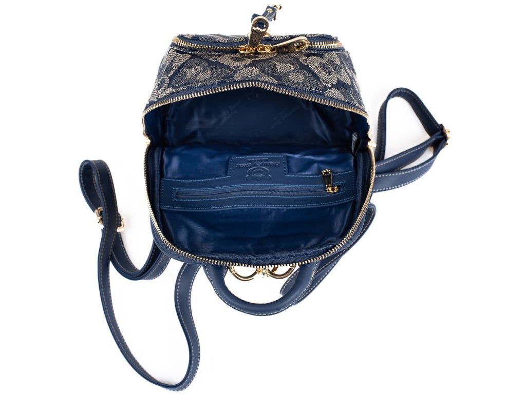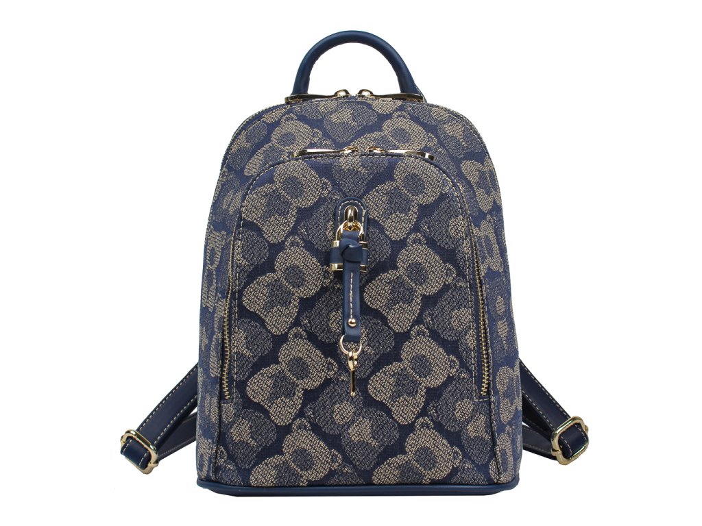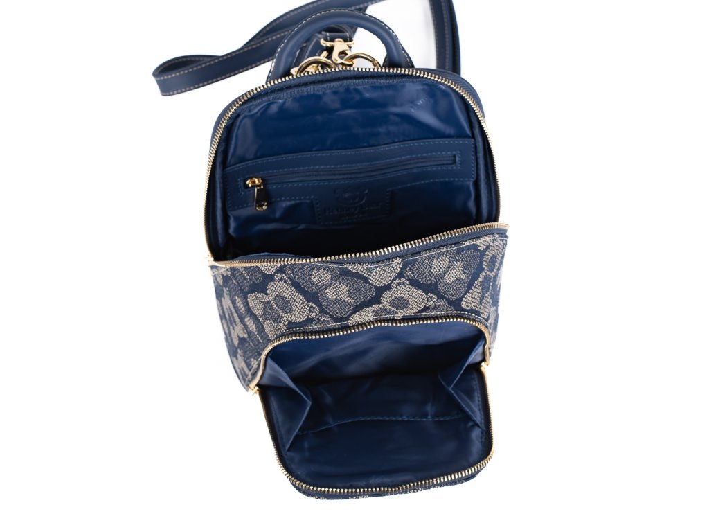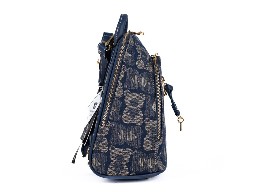 🐾 Design: Gobelínový materiál s tonálním medvědím vzorem v modro-šedých tónech působí sofistikovaně, ale přitom nápaditě. Zlaté zipy a detaily z tmavě modré veganské kůže podtrhují stylový vzhled.